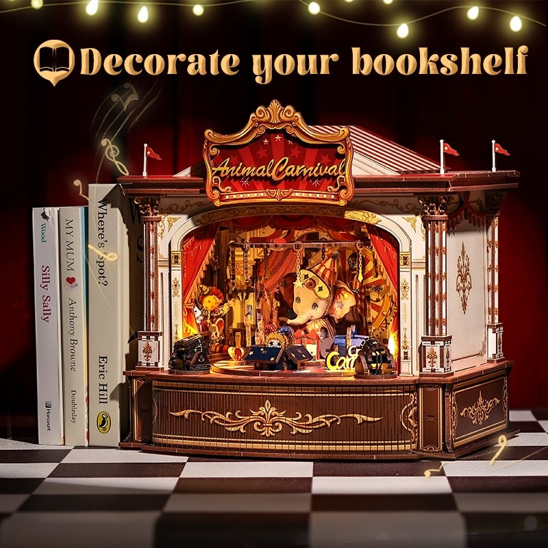 Build a joyful DIY wooden music box that doubles as a charming book nook. The Animal Carnival DIY Wooden Music Box brings a playful miniature stage to your shelf with cheerful scenes, gentle melodies, and warm lighting that celebrate classic carnival magic.