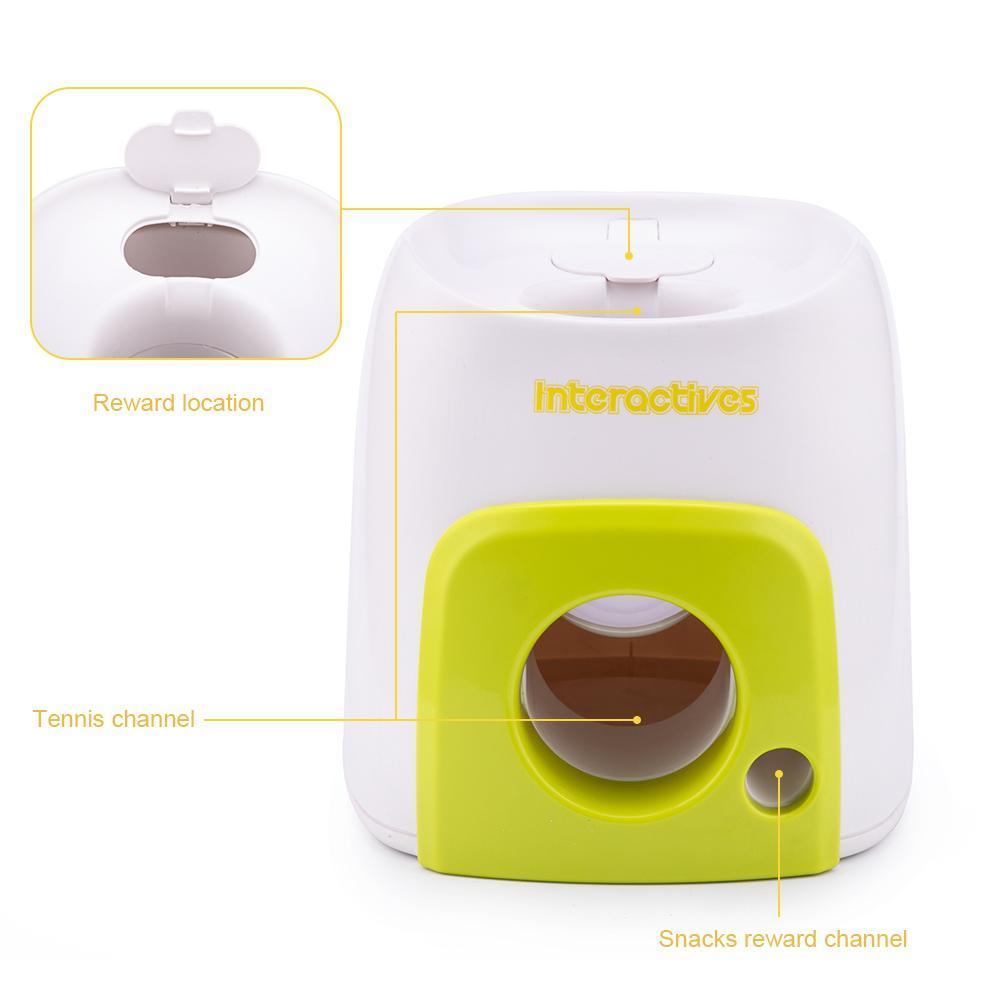 One of its most notable features is the dog treat dispenser. You can put dog treats in the little treat compartment and each time the ball is dropped down the ball chute and thrown out, the dog ball thrower will simultaneously dispense the treats you put in.