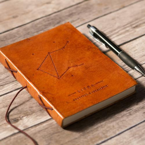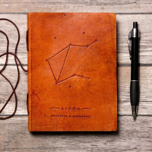 Genuine leather journal embossed with the Libra astrological zodiac symbol and the words “graceful and idealistic.” The journal is encased in a rich brown leather cover with a string tie closure and stitched in paper, giving it an old world feel.