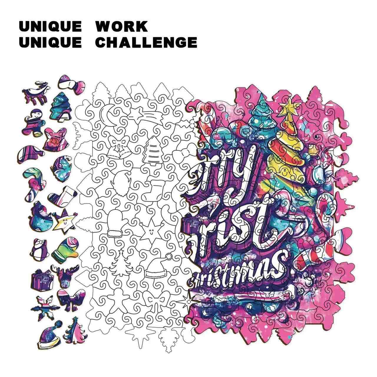 Celebrate the magic of Christmas with this Merry Christmas Wooden Jigsaw Puzzle, designed in a vibrant watercolor pop art style. Featuring bold hand-lettering, whimsical candy canes, and festive Christmas trees, this puzzle bursts with joyful holiday energy. Unlike traditional square puzzles, it has an irregular shaped edge that follows the artwork, creating a one-of-a-kind puzzle experience.