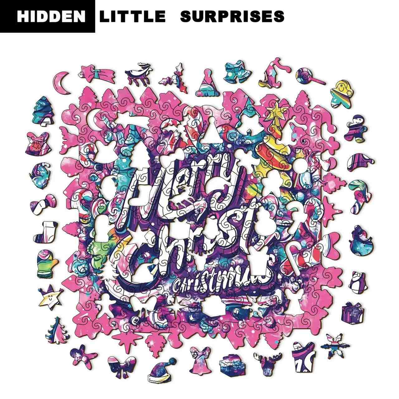 This puzzle showcases a modern pop art watercolor look with bright pink, blue, purple, and golden tones. The large “Merry Christmas” lettering is surrounded by playful holiday motifs—ornaments, snowflakes, and glowing trees—making it both fun to solve and beautiful to display.
