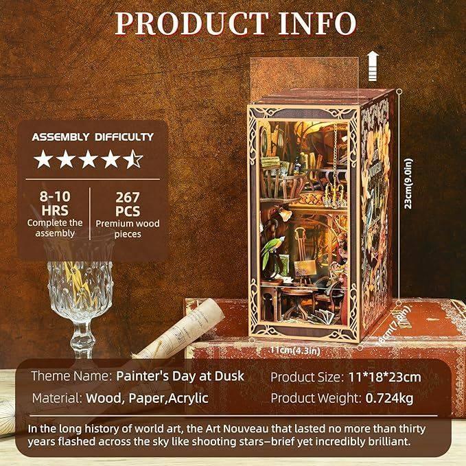 Immerse yourself in the elegance and charm of the Art Nouveau era with the Painter’s Day at Dusk DIY Book Nook Kit. This exquisite kit lets you recreate a miniature art studio that embodies the beauty and creativity of this iconic artistic movement.