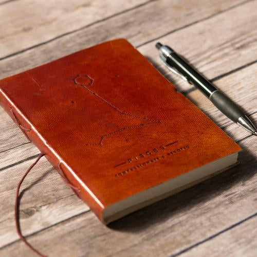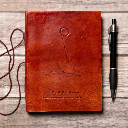 Genuine leather journal embossed with the Pisces astrological zodiac symbol and the words “compassionate and devoted.” The journal is encased in a rich brown leather cover with a string tie closure and stitched in paper, giving it an old world feel.