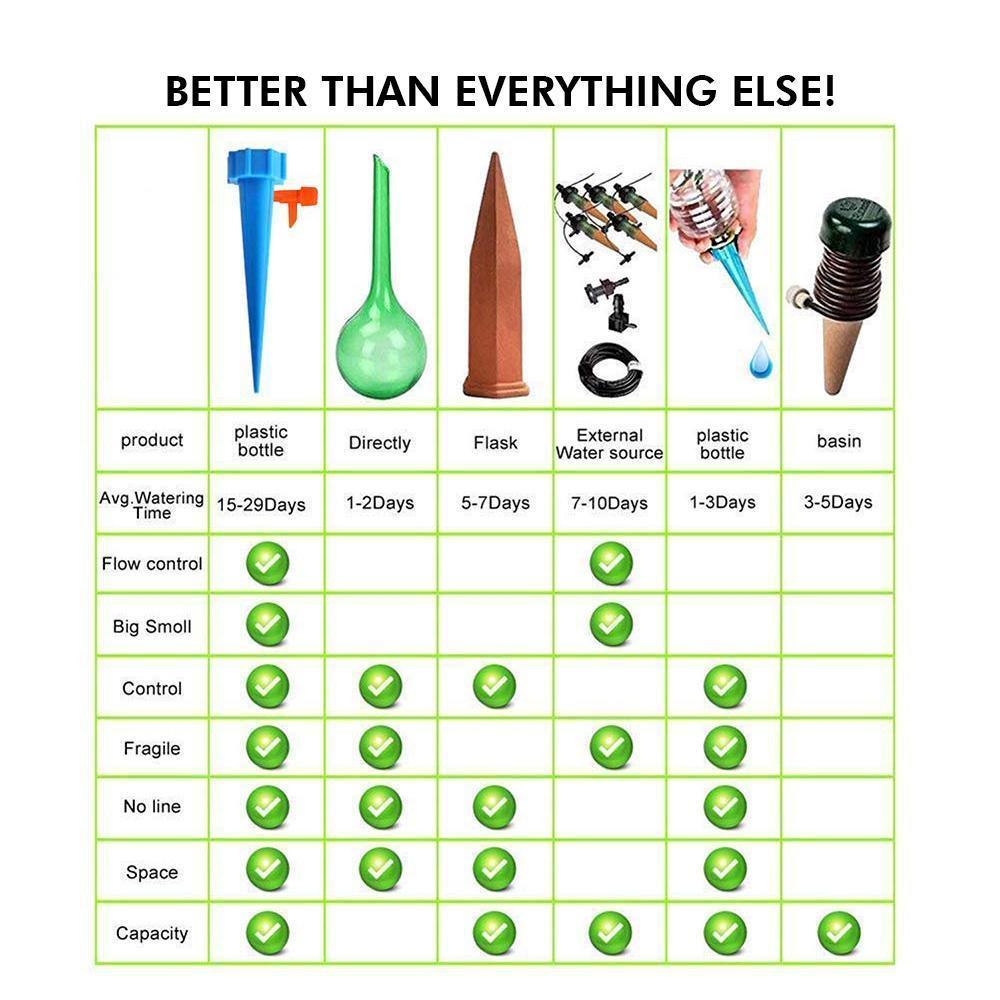 - Adjustable drip. How long will you be gone? Adjust the drip to last from 1 to 15 days, that way your plants never go thirsty.