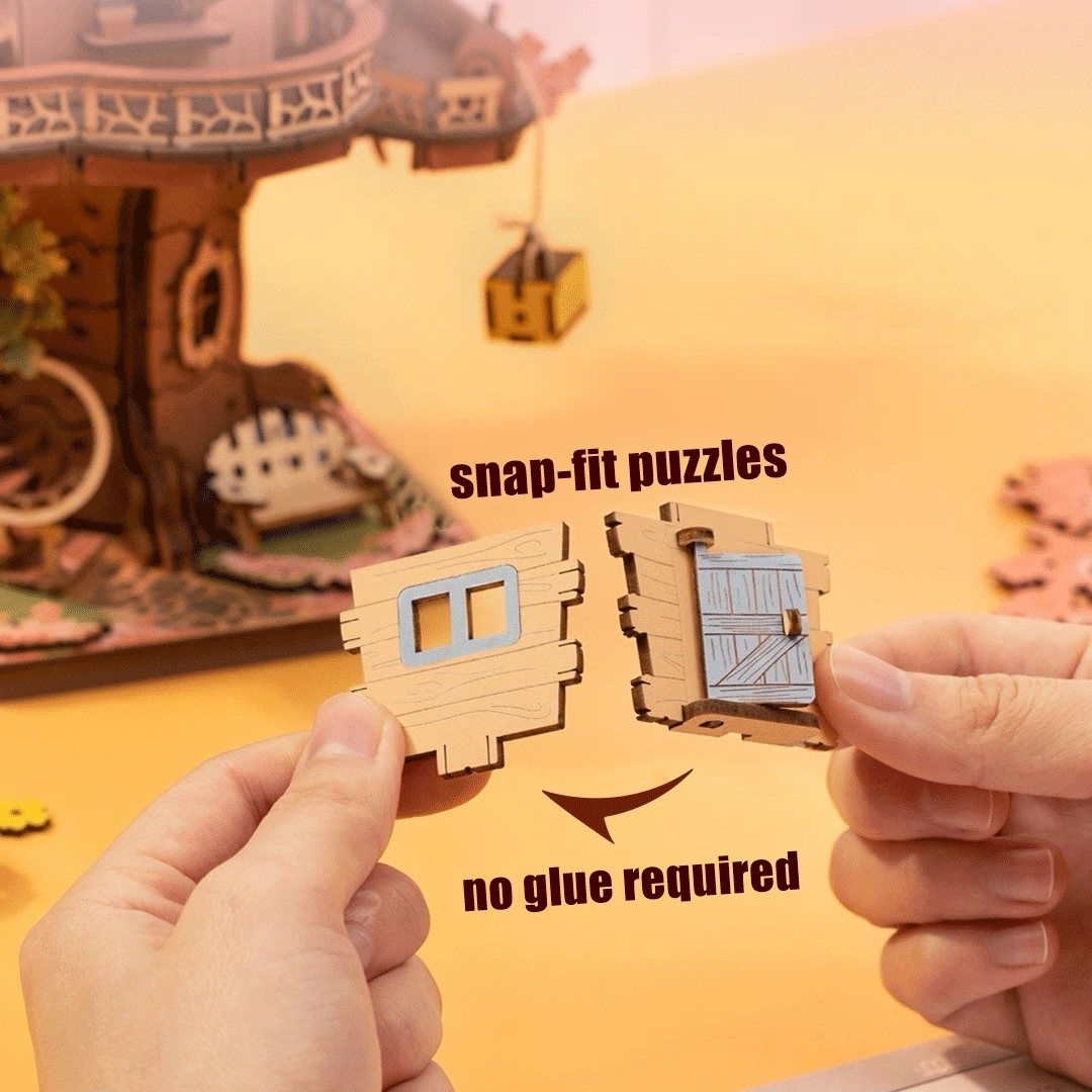 Each piece of this 3D wooden puzzle is precision-cut for a smooth and satisfying building experience. As you assemble your tree house, you’ll reveal intricate elements like sparkling cherry blossoms that glow beautifully once the lights are on. The thoughtful craftsmanship ensures every branch, petal, and beam fits perfectly to form a magical miniature world.